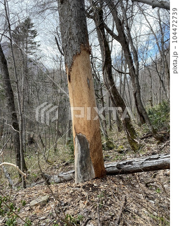 Fallen tree damaged by beavers lying on ground in forest near frozen lake, trunk covered in snow.