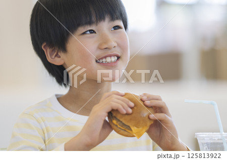 ハンバーガーを食べる親子 30代の父親と小学1年生の息子