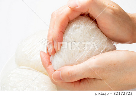 衛生面への配慮からラップを使用して握ったおにぎり。