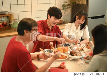 Asian Chinese family enjoying traditional foods together during Chinese New Year