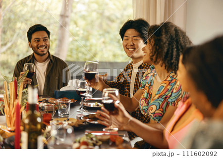 Happy friends enjoying in conversation and drinking wine during festive dinner at home party