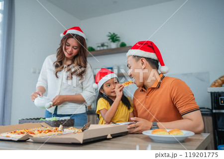Happy cheerful Asian family celebrating Christmas and New Year dinner party together, a family with mother and son. Asian lovely family celebrate Christmas - New Year festival.
