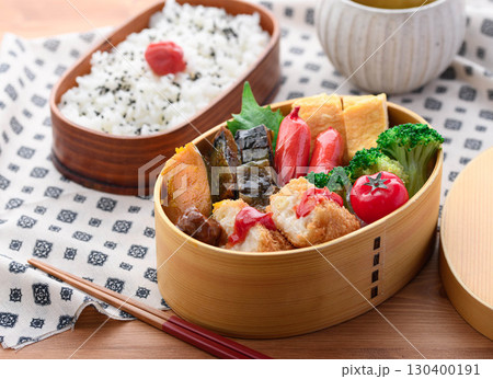 彩り豊かな和風弁当と白ご飯 家庭のランチや広告用に最適な日本のお弁当イメージ
