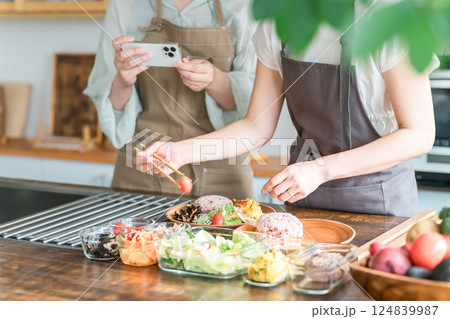 料理教室・クッキングスクールで料理をスマホで撮影する生徒の女性