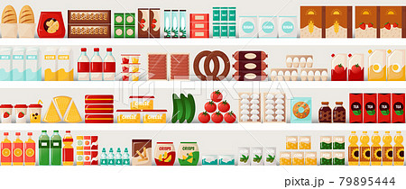 Supermarket food. Grocery shelves with cereal bread and milk, eggs or pasta. Market showcase template. Everyday products. Bottles and meal containers. Vector retail store background