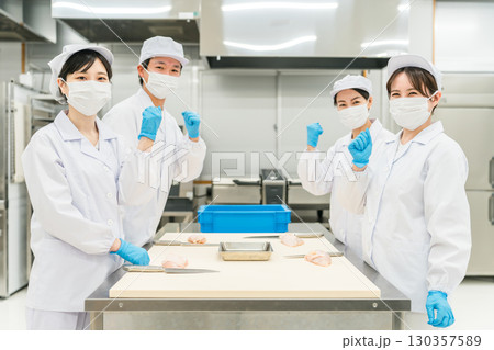 鶏肉を調理するコックコート姿の男女スタッフ(調理師・料理人・生鮮市場・食品加工)