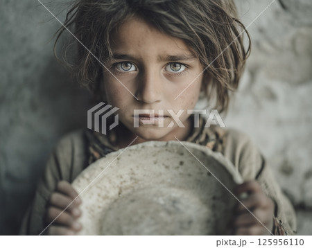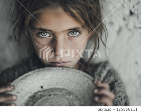 空の皿を持つ飢餓や貧困で苦しむ女の子のポートレート。社会問題・国際支援のイメージ素材