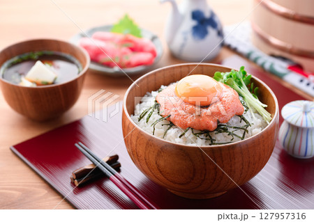明太子ご飯の木製丼盛り 和食ランチの美味しそうな写真