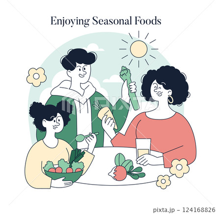 Spring brings families together to enjoy seasonal foods, highlighting the benefits of fresh produce. A joyful atmosphere is present as they share a meal filled with vibrant, healthy ingredients.