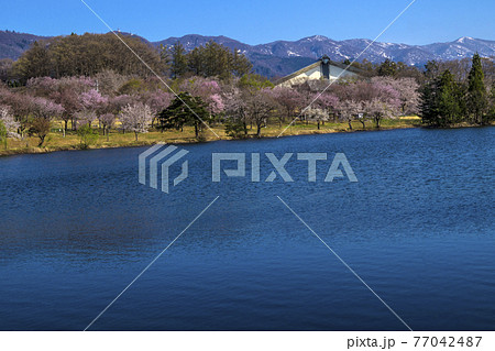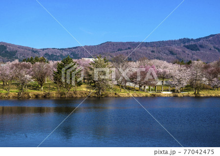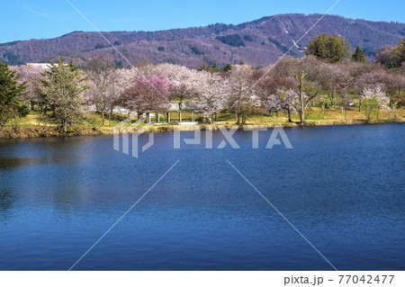 信州 長野県飯山市春の長峰スポーツ公園の針湖池の桜
