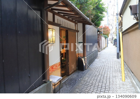 日本の東京都市景観 情緒漂う街。東京メトロ東西線 神楽坂駅 出入口2などを望む