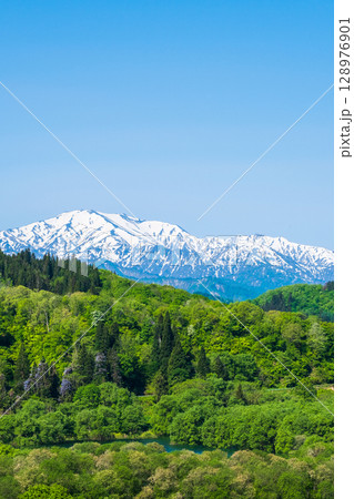 白川湖と飯豊山(山形県・飯豊町)