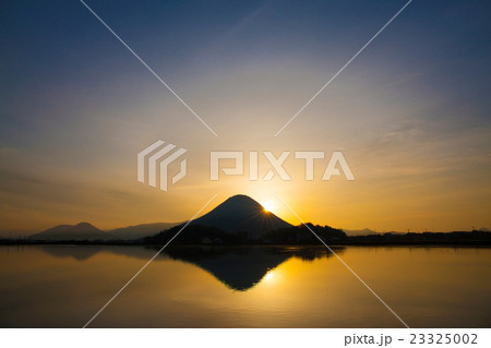 讃岐富士または飯野山という香川県の名山の日の出。宮池に映える「ダブルダイヤモンド讃岐富士」が美しい。