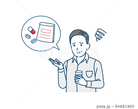 錠剤 サプリ 薬が飲めない 年配の男性 シニア 高齢者 困る 不安 悩む イラスト素材