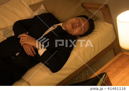 帰宅してソファで寝てしまう若いビジネスマン