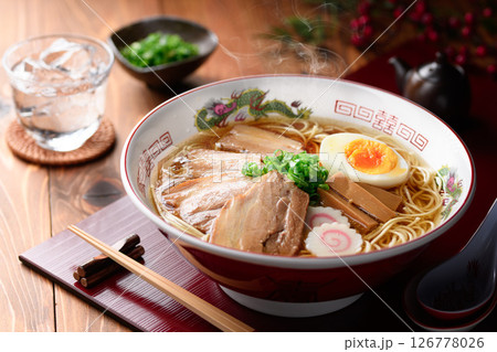 湯気立つ本格チャーシュー麺 煮卵・ナルト入り
