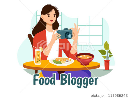 Food Blogger Vector Illustration featuring an Influencer Reviewing and Sharing Culinary Experiences on a Blog at a Restaurant in a Flat Background