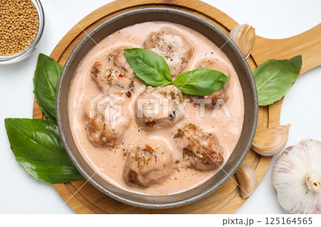 Thai food of spicy shrimp with curry, herb and red pepper on white plate
