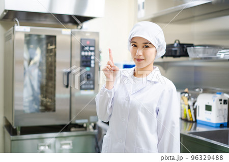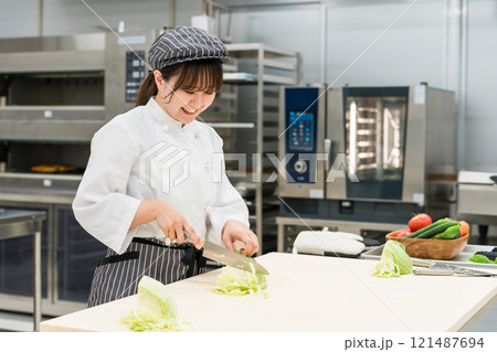 厨房・キッチンに立つコックコート姿の調理師・シェフ・コックの男女