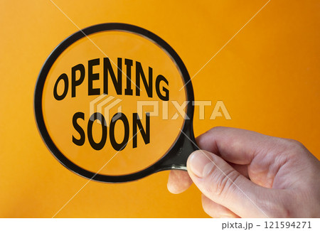 Opening soon symbol. Magnifying Glass with Concept word Opening soon. Beautiful orange background. Businessman hand. Business and Opening soon concept. Copy space