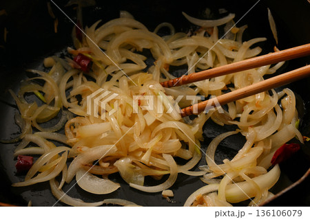 フライパンで玉ねぎを炒めている写真