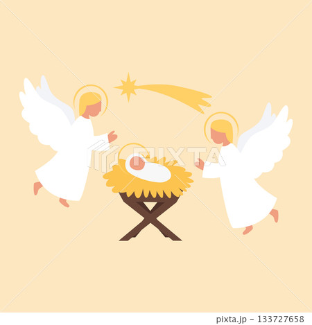 Nativity scene with angels and baby Jesus in a manger, minimalist flat Christmas illustration