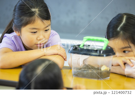 虫かごを観察する小学生