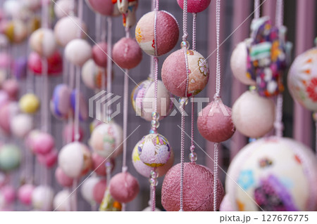 和布で作られた華やかなつるし飾りと優しい色合い