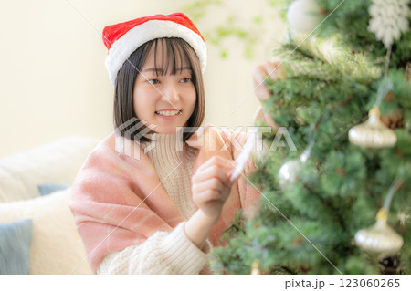 クリスマスツリーの飾り付けをする女の子