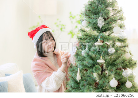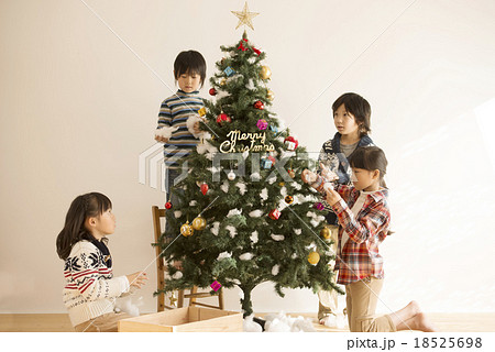 クリスマスツリーの飾り付けをする家族 母と父と祖母と娘と息子と赤ちゃん