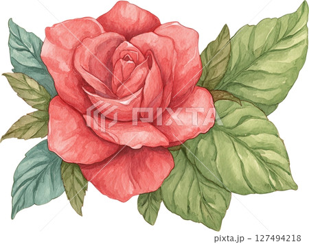 Delicate watercolor illustration of single red rose with lush green leaves, showcasing natural beauty and soft artistic expression
