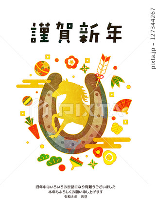 馬の飾りと正月の縁起物の年賀状テンプレート