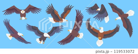 Bald Eagle flying icons set, American eagle with white tail and head, vector wild bird of prey soaring, falcon or hawk