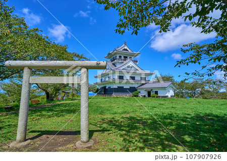 千葉県館山市館山の城山公園の浅間神社の鳥居越しに館山城(模擬天守)を見る