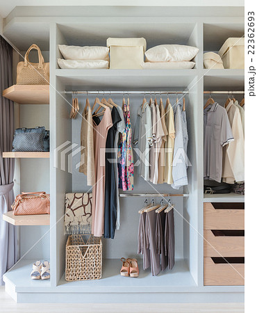 Modern wooden wardrobe with clothes hanging on rail in walk in closet