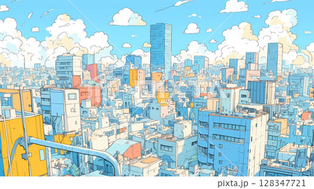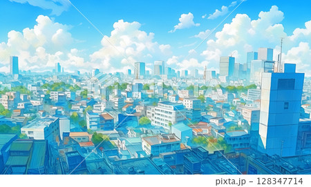 高層ビルが並ぶ都市の俯瞰図、夏の青空と雲が広がる中、透明感ある街の空気感を表現したシティポップ風