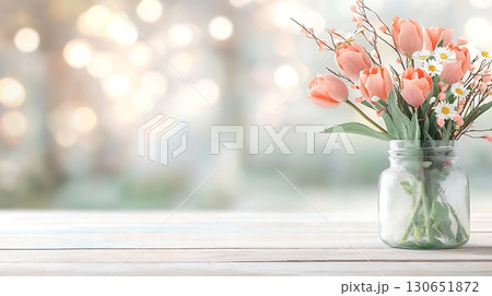 Beautiful Arrangement of Fresh Pink Tulips and Daisies in Glass Jar on Wooden Table