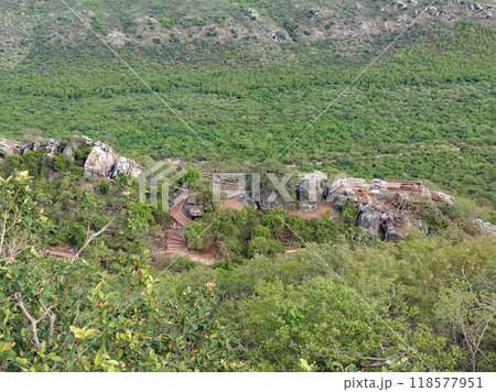 インドの仏教聖地マガダ国ラージギル王舎城の東郊外に聳える霊鷲山の香堂を上から望む