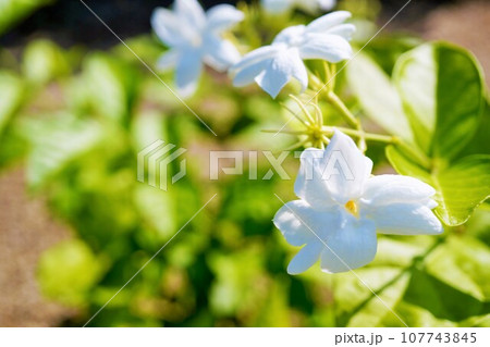 庭に植えられてよい香りを放つ白い花を咲かせる茉莉花、アラビアジャスミン