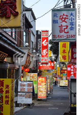 日本の横浜都市景観 食べ歩き…観光客らで賑わう横浜中華街・中華街大通りなどを望む。奥は香港路