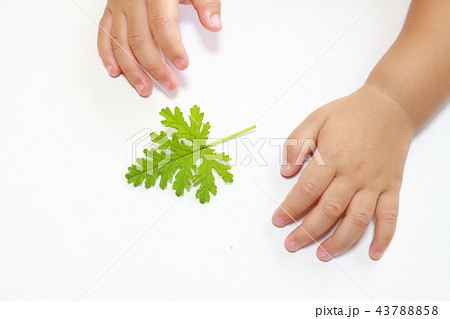 家庭菜園で育てたバジルを摘み取る乳児の手