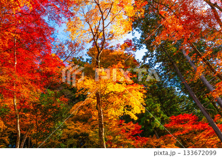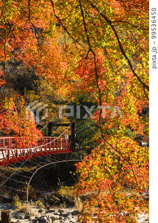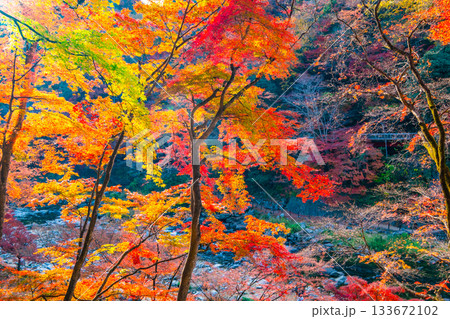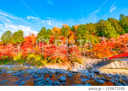 日本 愛知県豊田市足助町の香嵐渓の紅葉と巴川にかかる香嵐橋..