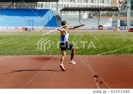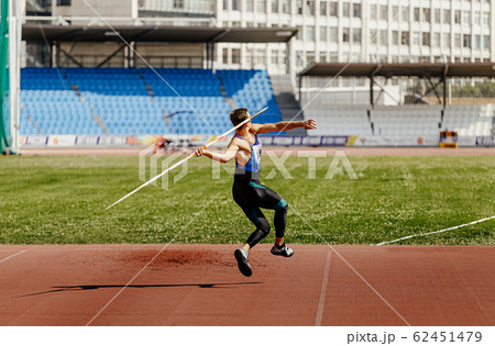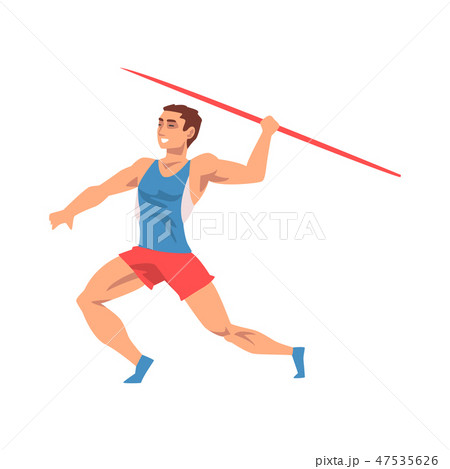 Javelin Thrower Male Athlete Character in Sports Uniform ith Spear, Active Sport Healthy Lifestyle