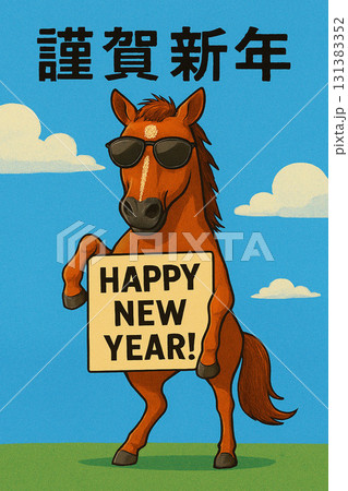 2026年、午年の年賀状、馬の被り物をしたポップでユーモアのある年賀状