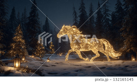Majestic glowing horse made of lights runs through a snowy forest at night with lanterns illuminating the path