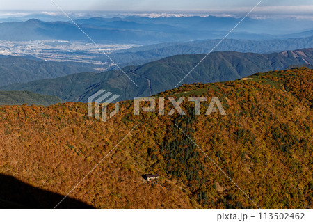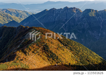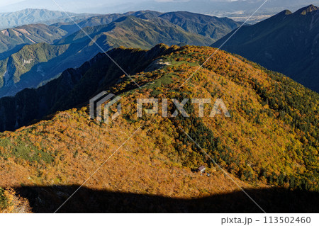 南アルプス・仙丈ヶ岳稜線から見る馬ノ背の紅葉ち冠雪の北アルプス