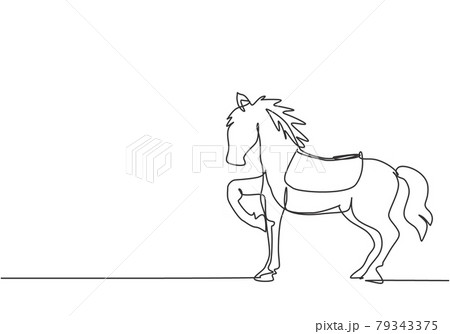 Continuous one line drawing a circus horse stands on the show arena, lifting one of its legs while preparing to perform an attraction. Trained horse. One line draw design vector graphic illustration.