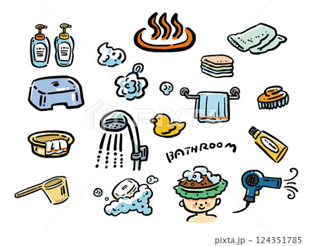 お風呂用品の手描き風イラストセット
