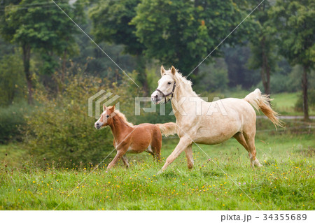 Horse mare and her very small foal on a farm