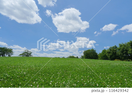 夏の青空と白い雲と草原に生えるシロナツメクサ